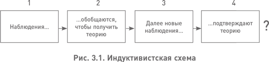 Этот вопрос известен как «проблема индукции». Название его происходит от того, что на протяжении большей части истории науки было доминирующим представлением о том, как она работает. Это представление заключалось в существовании способа обоснования вывода, не дотягивающего по строгости математического доказательства, но тем не менее достойного внимания, который называется индукцией. Индукции противопоставляли с одной стороны якобы безупречные доказательства, предоставляемые дедукцией, а с другой стороны — считающиеся ещё более слабыми философские или интуитивные способы рассуждения, не поддержанные даже результатами наблюдений. В индуктивистской теории научного знания наблюдения играют двоякую роль: сначала — при открытии научных теорий, затем — при их доказательстве. Предполагается, что теорию открывают, «экстраполируя» или «обобщая» результаты наблюдений. Тогда, если обширное множество наблюдений соответствует теории и ни одно из них не отклоняется от неё, теорию считают обоснованной — то есть более правдоподобной, вероятной или надёжной. Эта схема показана на рис. 3.1.