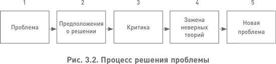Проблему обычно решают путём нахождения новых или усовершенствованных теорий, которые содержат объяснения, избавленные от недостатков, но сохраняющие достоинства существовавших объяснений (рис. 3.2). Таким образом, после того, как проблема проявила себя (этап 1), всегда следует предположение (или догадка, или гипотеза): в надежде решить проблему предлагается новая теория или изменяется или переосмысливается старая (этап 2). Затем гипотезы подвергают критике, что (если критика рациональна) включает изучение и сравнение теорий, чтобы понять, какая из них предлагает лучшие объяснения относительно критериев, присущих проблеме (этап 3). Если предлагаемая теория не проходит испытание критикой, то есть предлагает худшие объяснения по сравнению с другими теориями, от неё отказываются. Если же мы видим возможность заменить одну из первоначальных теорий на одну из вновь предложенных (этап 4), то мы предварительно считаем, что делаем успехи в решении проблемы. Я говорю «предварительно», потому что последующее решение проблемы, возможно, потребует уточнения или замены даже этих новых, удовлетворительных на первый взгляд теорий, а иногда даже возврата к некоторым из ранее признанных неудовлетворительными. Таким образом, решение, каким бы хорошим оно ни было, ещё не конец процесса: это начало процесса решения следующей проблемы (этап 5). Это описание иллюстрирует ещё одно заблуждение индуктивизма. В науке цель заключается не в том, чтобы найти теорию, которая будет или может рассчитывать на то, чтобы считаться истиной вечно, а в том, чтобы найти лучшую на данный момент теорию и, если это возможно, уточнить все имеющиеся теории. Научное обоснование предназначено для того, чтобы убедить нас: данное объяснение — лучшее из имеющихся. Оно ничего не говорит, да и не может сказать, относительно того, выдержит ли это объяснение впоследствии новую критику и сравнение объяснениями, которые ещё предстоит найти. Хорошее объяснение может дать хорошие предсказания относительно будущего, но ни одно объяснение не способно предугадать содержание или качество своих будущих конкурентов.