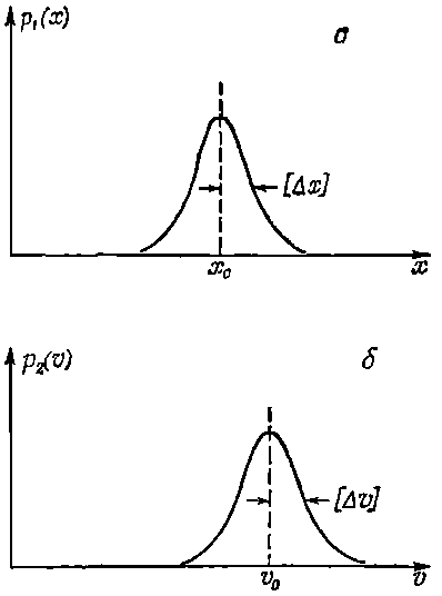 Для описания местоположения частицы можно ввести плотность вероятности p1(x), так что p1(x)?x будет вероятностью того, что частица находится где-то между х и х+?x. Если положение частицы установлено достаточно хорошо, то примерный вид функции p1(x) может иллюстрировать график, приведенный на фиг. 6.10, а.