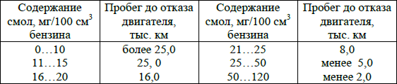 Повышенная концентрация смол значительно уменьшает пробег до появления отказов двигателя в результате интенсивного нагарообразования (табл. 18).