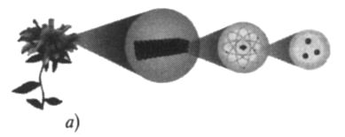 Возьмите любое тело — кусок льда, каменную глыбу, железную плиту — и представьте, что его делят пополам, затем один из кусков ещё пополам и т. д.; представьте продолжающееся деление материала на всё более мелкие куски. Примерно 2500 лет назад древние греки сформулировали проблему определения мельчайшей неделимой составляющей, которая являлась бы конечным продуктом такой процедуры. В наше время мы узнали, что рано или поздно вы придёте к атомам, но атомы не являются ответом на вопрос греков, поскольку они могут быть разделены на более мелкие составляющие. Атомы могут быть расщеплены. Мы узнали, что они состоят из электронов, которые роятся вокруг центрального ядра, а оно, в свою очередь, состоит из ещё более мелких частиц — протонов и нейтронов. А в конце 1960-х гг. эксперименты на Стэнфордском линейном ускорителе показали, что даже сами нейтроны и протоны построены из более фундаментальных составляющих: каждый протон и каждый нейтрон состоит из трёх частиц, называемых кварками, как было отмечено в главе 9 и как проиллюстрировано на рис. 12.3а.