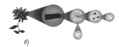 Рис. 12.3. (а) Обычная теория основана на электронах и кварках как базовых составляющих материи. (б) Теория струн предполагает, что каждая частица на самом деле является вибрирующей струной