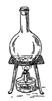 Что касается фиолетовых паров, на которые я обратил ваше внимание, это - газообразный йод. Если вам удастся достать в аптекарском магазине йод не в виде обычной тинктуры, то-есть спиртного раствора, а в форме кристаллических сероватых чешуек слабо металлического блеска, положите несколько таких кристалликов в тонкостенную колбу, закрытую пробкой, и слегка подогрейте в пламени спиртовой лампы. Нагревайте осторожно (рис. 41), вращая колбу, чтобы все дно ее нагревалось равномерно. Колба наполнится газообразным йодом великолепного фиолетового цвета (отсюда и название этого элемента: "йод" значит - фиолетовый). На холодных стенках горда колбы и на основании пробки он осядет мельчайшими блестящими кристалликами. Опыт можно повторять сколько угодно раз.