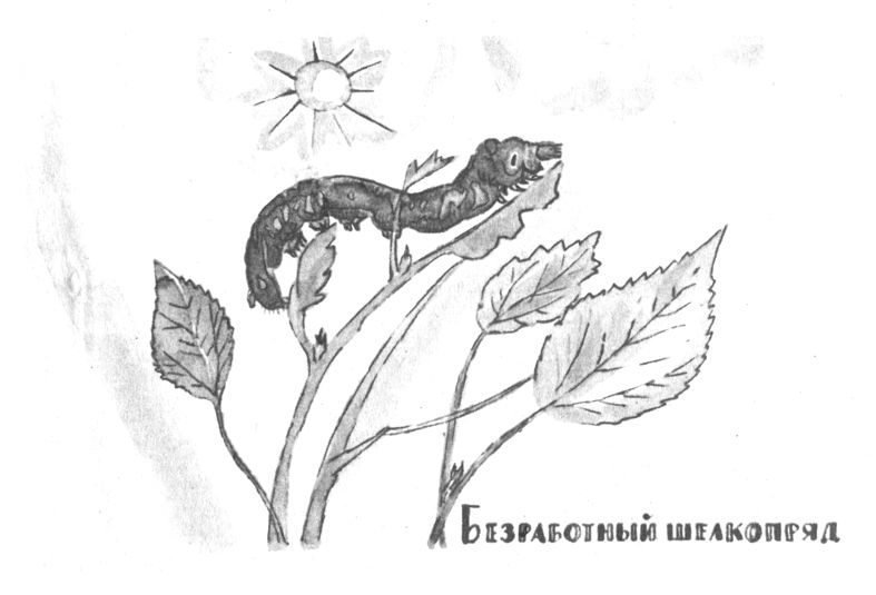 Там, на подвесных койках в три яруса, как матросы в кубрике, жили белые, толстые гусеницы. У каждой было целых две пары челюстей, потому что таким обжорам одной бы не хватило, ведь им нужно было сделать хороший запас на то время, когда они обмотаются коконом из шёлковых ниточек и улягутся спать. Они ели тутовые листья днём и вечером, ночью и утром, и ели так жадно, что листья шуршали, и Шелкопряду пришлось говорить очень громко.