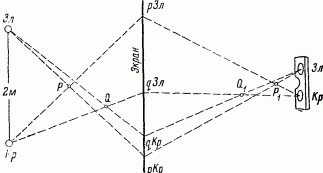 Сейчас было объяснено, что при таких условиях порождается иллюзия телесного образа, выступающего впереди экранной плоскости. Иллюзии, достигаемые «чудесами теней», чрезвычайно забавны: порой кажется, что брошенный предмет летит прямо в зрителя; какой-нибудь исполинский паук шагает по воздуху в публику, заставляя ее невольно вскрикивать и отворачиваться. Аппаратура здесь крайне проста; она понятна из рис. 134, где Зл и Кр означают зеленую и красную лампы (слева); Р и Q — предметы, помещенные между лампами и экраном; р и q со значками Зл и Кр — окрашенные тени этих предметов на экране; Р1 и Q1 — места, в которых видит эти предметы зритель, смотрящий через окрашенные пленки — зеленую (Зл) и красную (Кр). Когда бутафорский «паук» за экраном переносится из Q в Р, зрителю кажется, что он перебегает из Q1 в P1.