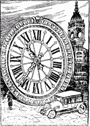 Ту ошибку, которую сделал ваш гость при оценке высоты книги, мы делаем постоянно и при определении величины предметов, помещенных очень высоко. Особенно характерна ошибка, которую мы совершаем при определении размеров башенных часов. Мы знаем, конечно, что такие часы очень велики, — и все же представление наше об их величине значительно уступает действительности. Прилагаемый рис. 135 изображает циферблат знаменитых часов Вестминстерского аббатства в Лондоне, перенесенный на мостовую улицы.