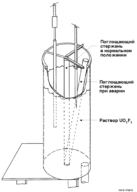 Сборка с урановым раствором; центральный поглощающий цилиндр отклонился от нормального положения; единичный всплеск мощности; незначительные дозы облучения.