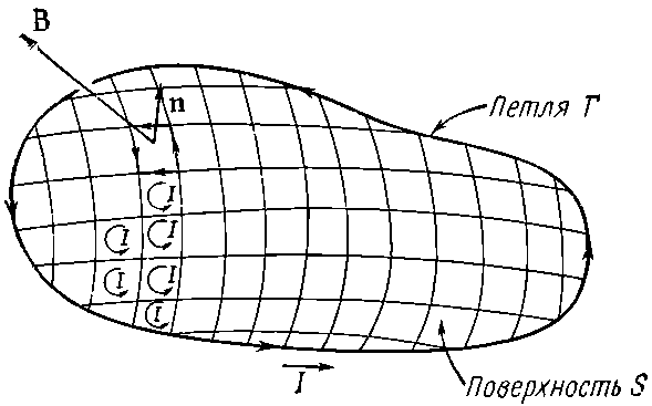 Натянем на эту петлю поверхность S, а на ней наметим множество петелек, каждую из которых можно считать плоской. Если заставить ток I циркулировать по каждой петельке, то в итоге выйдет то же самое, как если бы ток шел только по петле Г, ибо токи на всех внутренних линиях взаимно уничтожатся. Система небольших токов физически не будет отличима от исходного контура, и энергия должна быть той же, т. е. должна быть равна сумме энергий всех петелек.