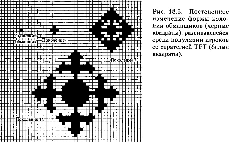 Вначале Аксельрод хотел применить эту плоскостную модель для изучения конкретных ситуаций, связанных с распределением стратегий. Подход позволяет визуально моделировать процессы захвата, обороны, образования границ и т.д., что представлялось интересным и наглядным. Аксельроду удалось показать, что при некоторых значениях размера выигрыша даже один обманщик способен распространить свое влияние на все сообщество TFT-игроков, т.е. навязать всем игрокам новый тип стратегий, основанных на обмане. Интересно, что образующиеся при этом колонии обманщиков имеют правильную и довольно сложную геометрическую форму, напоминающую снежинки (рис. 18.3).