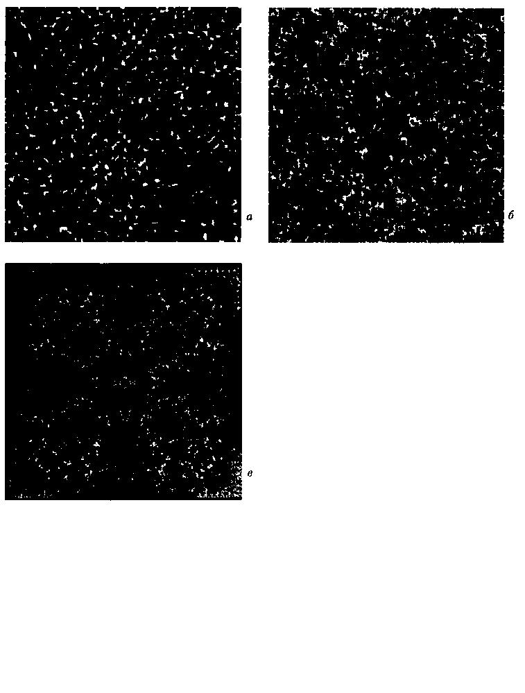Рис. 18.5. Состояния, описывающие эволюцию системы из безусловных кооператоров (черные точки) и безусловных обманщиков (серые точки), очень сильно зависят от размера выигрыша при обмане по сравнению с сотрудничеством. При малом выигрыше доминирует сотрудничество (а). (Здесь белые точки соответствуют «перебежчикам» из кооператоров в обманщики в последнем раунде, т. е. эти точки указывают направления смещения границ.) При увеличении выигрыша при обмане картина меняется, и обманщики начинают доминировать, хотя островки кооператоров возникают и исчезают по всей решетке (б). Одинокий обманщик может эксплуатировать целое сообщество кооператоров, постепенно создавая сообщество обманщиков. В силу взаимного отталкивания обманщики не могут образовывать целостные структуры, а создают лишь разреженный узор (в)