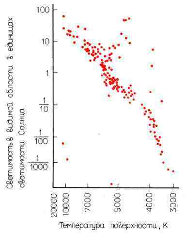 Близкие звезды особенно важны для нас, поскольку мы можем относительно точно определить расстояния до них (см. приложение Б). Поэтому по их яркости легко вычислить истинную светимость. Мы имеем в виду светимость в видимой области спектра, измеренную с помощью фотометра с цветным фильтром, который имитирует цветовую чувствительность глаза. Температура поверхности измеряется с помощью дополнительного определения яркости с другим цветовым фильтром, как правило, голубого цвета. Зная яркость звезды в голубой области спектра и общую яркость в видимом диапазоне, который сдвинут в красную сторону, можно определить цвет звезды, а, следовательно, и температуру ее поверхности. Для каждой звезды, температура поверхности и светимость в видимой области спектра которой определены таким способом, можно поставить точку на диаграмме Г-Р. На рис. 2.2 приведены данные для звезд соседей Солнца. Хорошо видно, что диаграмма Г-Р заполнена точками неравномерно. Точки для большинства звезд лежат в пределах полосы, которая идет из левого верхнего края рисунка (от голубых звезд с большой светимостью) направо вниз к тусклым звездам красного цвета. Некоторые звезды расположены справа вверху в области красных гигантов. Слева внизу мы видим три белых карлика.
