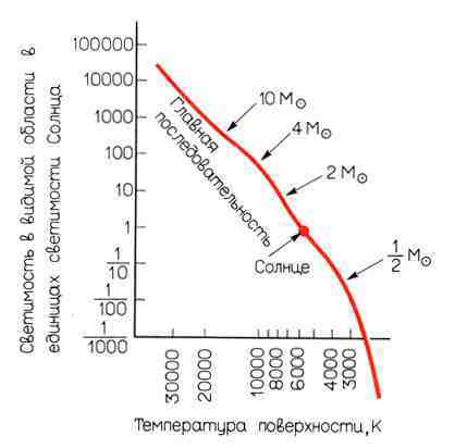 Звезды главной последовательности обладают одним важным свойством, которое связано с их массой. Мы знаем массу звезд лишь для некоторых из этих светил. Ее можно точно определить, только когда вокруг звезды движется спутник. Мы уже знаем, что траектории планет, движущихся вокруг нашего Солнца, позволяют вычислить его массу. Движение спутника Сириуса позволило нам узнать, что Сириус А содержит примерно в 2,3 раза больше вещества, чем Солнце, и что масса его спутника близка к солнечной. Этот метод дал возможность определить массу некоторых звезд (принцип, лежащий в его основе, коротко изложен в приложении В). Наиболее тяжелые звезды главной последовательности содержат примерно в 30–50 раз больше вещества, чем Солнце. Масса самых маленьких звезд составляет несколько десятых солнечной массы.