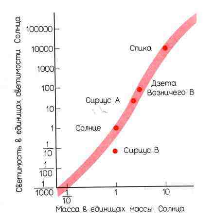 Для звезд главной последовательности, масса которых была определена по движению их спутников, выполняется важная закономерность: в каждой точке главной последовательности расположены звезды с определенной массой (рис. 2.3). Звезды с малой массой расположены внизу, а наиболее тяжелые звезды-вверху. Если идти вдоль главной последовательности снизу вверх, то масса звезд постепенно возрастает. Поскольку при этом увеличивается и светимость звезд на диаграмме Г-Р, то можно сказать: чем выше светимость звезды главной последовательности, тем больше ее масса. Если сравнить две звезды главной последовательности, то у звезды с большей светимостью и масса будет больше. Пойдем и дальше: массу звезды можно непосредственно определить по ее светимости, если известно, что звезда принадлежит к главной последовательности. На рис. 2.4 показано, как возрастает светимость с увеличением массы звезд главной последовательности. Астрономы называют эту закономерность диаграммой масса-светимость. В частности, эта закономерность выполняется для звезд, которые нам уже знакомы: речь идет о Солнце, Сириусе А и Спике, которые принадлежат к главной последовательности. Для белого карлика Сириус В этот закон не выполняется — звезда не лежит на главной последовательности.