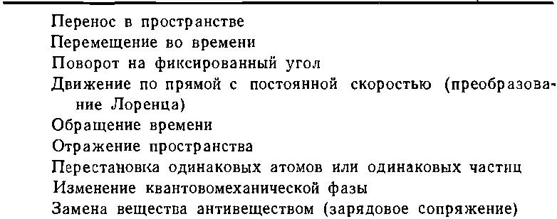 Однако что же такое симметрия? Каким образом физический закон может быть «симметричным»? Проблема определения симметрии — одна из основных. Мы уже говорили об очень хорошем определении, которое было дано Вейлем. Суть его состоит в том, что объект считается симметричным, если с ним можно сделать нечто такое, после чего он будет выглядеть точно так же, как и прежде. Например, симметрична ваза, которая, отразившись в зеркале или будучи повернута вокруг своей оси, выглядит точно так же, как и до поворота или отражения. Вопрос, который мы хотим разобрать здесь,— это, что можно сделать с физическим явлением или ситуацией, возникшей при эксперименте, чтобы получился тот же самый результат. Список операций симметрии, в результате которых различные физические явления остаются неизменными, приведен в табл. 52.1.