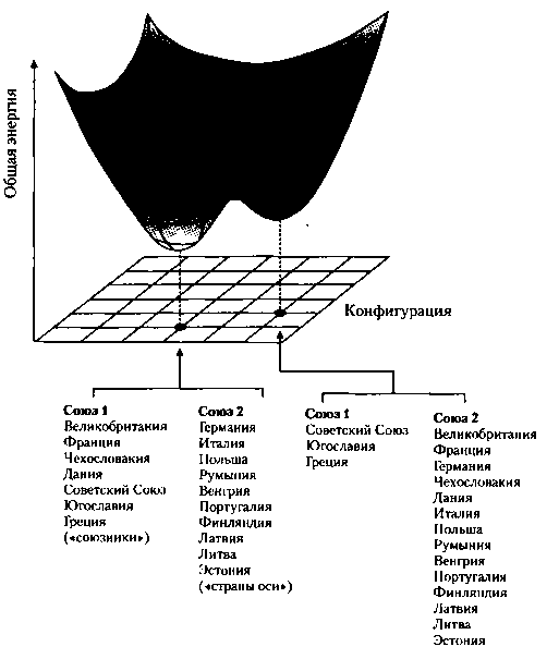 Полученный в результате расчетов энергетический ландшафт выглядит потрясающе. Имеются две широкие впадины[110] (рис. 12.4). Одна из них (более глубокая) соответствует конфигурации, почти точно совпадающей с раскладом сил в войне, различие сводится лишь к тому, что Польша и Португалия отнесены с странам оси. Совпадение представляется поразительным, так как вероятность такого случайного совпадения в данной модели составляет лишь около 200[111].