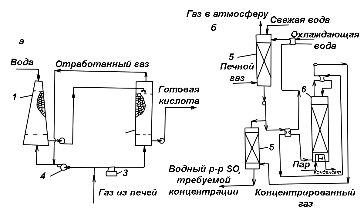 Существует способ укрепления башенной кислоты за счет получения газа с высоким содержанием SO2. Это так называемый абсорбционно-десорбционный способ (см рис. 32). Суть его заключается в отгонке SO2 из раствора. Прежде всего получают водный раствор SO2 в обычном абсорбере. Затем, нагрев его предварительно в теплообменниках до 100°, подают в десорбер. Здесь раствор нагревают паром и выделяют концентрированный сернистый газ вместе с парами воды. Пар конденсируют в теплообменнике, подогревающем раствор перед десорбером, и отделяют таким образом 100 %-ный сернистый газ. Жидкость из десорбера, охлажденная в теплообменнике направляется на получение свежего раствора SO2.
