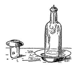 Смотрите. Я беру ленточку металла магния, порошок которого жгут для освещения помещений при фотографических съемках. Один конец ее укрепляю в пробке, пробкою же закупориваю бутылку с отрезанным дном, так что ленточка висит внутри нее. На тарелку наливаю воды, зажигаю магний снизу и ставлю бутылку в тарелку.