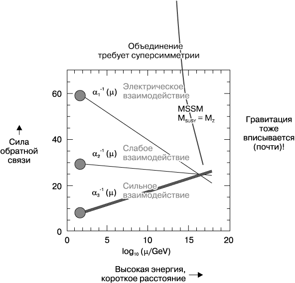 Рис. 20.2. Изначально гравитация смехотворно слаба, но на малых расстояниях ее мощность приближается к мощности других видов взаимодействия; и все они собираются вместе, подходя довольно близко друг к другу