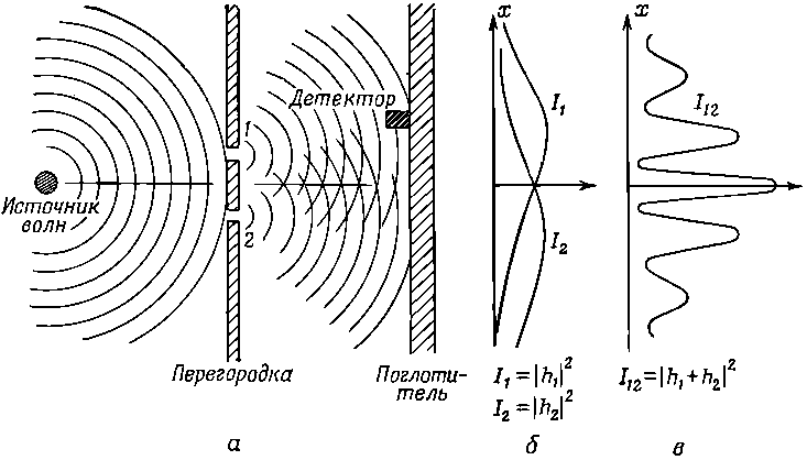 Мы видим со всей определенностью, что интенсивность I12, наблюдаемая, когда оба отверстия открыты, не равна сумме интенсивностей I1 и I2. Мы говорим, что здесь происходит «интерференция», наложение двух волн. В некоторых местах (где на кривой I12 наблюдается максимум) волны оказываются «в фазе», пики волн складываются вместе, давая большую амплитуду и тем самым большую интенсивность. В этих местах говорят о «конструктивной интерференции». Она наблюдается в тех местах, расстояние которых от одной из щелей на целое число длин волн больше (или меньше) расстояния от другой.
