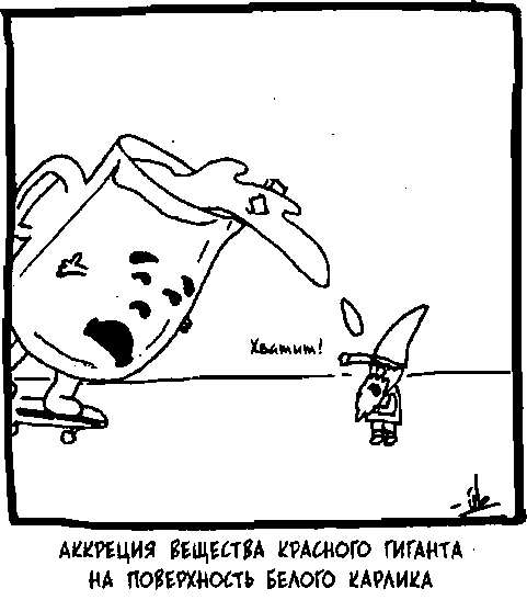 Сверхновые типа 1а состоят из белого карлика и красного гиганта, вращающихся по орбитам вокруг друг друга. Белый карлик — тлеющее ядро звезды, довольно плотное. Красный гигант очень большой, и его гравитации не хватает на то, чтобы удержать все его владения под контролем. В нашем случае это означает, что газ из внешней атмосферы красного гиганта падает на поверхность белого карлика.