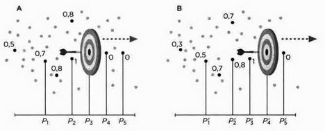 Два положения движущейся мишени и связанные с ними изменения вероятностей в каждой точке.