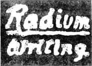 Рис. 13. Фотография, снятая лучами радия. Фредерик Содди сделал такой опыт: он взял стеклянную трубочку, в которой было немного радия, и фотографическую пластинку, запертую в кассету, в которую не проникает ни один луч света Содди стал водить трубочкой, как карандашом по кассете. Лучи, испускаемые радием, прошли через кассету, и на пластинке отпечатались те самые слова — Radium writing («писание радием»), — которые Содди вывел на кассете своей трубочкой. После этого Содди проявил пластинку, отфиксировал ее и приготовил позитив