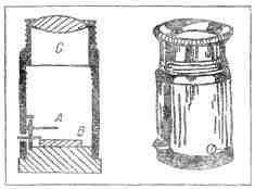 Рис. 14. Справа — прибор Крукса для наблюдения вспышек на сернистом цинке. Слева — схема прибора (А — пылинка радия на кончике иглы, В — сернистый цинк, С — лупа)