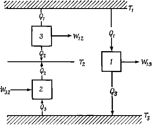 Другая машина работает при перепаде температур T2 и Т3. Предположим, что эта машина устроена так, что она поглощает то же тепло Q3 при температуре Т3 и отдает тепло Q2. Тогда нам придется затратить работу W32, ведь мы заставили машину работать в обратном направлении. Цикл первой машины заключается в поглощении тепла Q1 и выделении тепла Q3 при температуре Т3. Вторая машина в это время забирает из резервуара то же самое тепло Q3 при температуре T3 и отдает его в резервуар с температурой Т2. Таким образом, чистый результат цикла этих спаренных машин состоит в изъятии тепла Q1 при температуре Т1 и выделении тепла Q2 при температуре T2. Эти машины эквивалентны третьей, которая поглощает тепло Q1 при температуре Т1, совершает работу W12 и выделяет тепло Q2 при температуре Т2. Действительно, исходя из первого закона, можно сразу же показать, что W12=W13-W32: