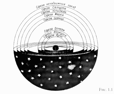 Аристотель думал, что Земля неподвижна, а Солнце, Луна, планеты и звезды обращаются вокруг нее по круговым орбитам. Он так полагал, ибо в соответствии со своими мистическими воззрениями Землю считал центром Вселенной, а круговое движение — самым совершенным. Птолемей во II веке развил идею Аристотеля в полную космологическую модель. Земля стоит в центре, окруженная восемью сферами, несущими на себе Луну, Солнце и пять известных тогда планет: Меркурий, Венеру, Марс, Юпитер и Сатурн (рис. 1.1). Сами планеты, считал Птолемей, движутся по меньшим кругам, скрепленным с соответствующими сферами. Это объясняло тот весьма сложный путь, который, как мы видим, совершают планеты. На самой последней сфере располагаются неподвижные звезды, которые, оставаясь в одном и том же положении друг относительно друга, движутся по небу все вместе как единое целое. Что лежит за последней сферой, не объяснялось, но во всяком случае это уже не было частью той Вселенной, которую наблюдает человечество.