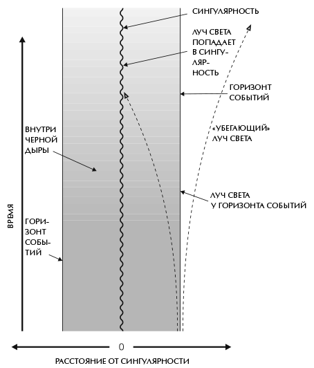 До 1970 года мои изыскания в области общей теории относительности касались в основном вопроса о том, существовала ли сингулярность в момент Большого взрыва. Но однажды вечерорм в ноябре того года, вскоре после рождения дочери Люси, я задумался о черных дырах, готовясь ко сну. Из-за моей болезни процесс это довольно медленный, поэтому у меня было много времени для размышлений. Тогда еще не существовало ясного представления о том, какие точки пространства-времени находятся внутри черной дыры, а какие – снаружи. Я уже обсуждал с Роджером Пенроузом идею определить черную дыру как множество событий, из которых невозможно уйти на большое расстояние, и это определение сейчас стало общепринятым. Оно означает, что граница черной дыры – горизонт событий – образована путями лучей света, которые и не сворачивают к сингулярности, и не могут покинуть черную дыру, оставаясь на грани между двумя «маршрутами» (рис. 7.1). Это напоминает попытку убежать от полицейских, когда преступник остается на шаг впереди, но при этом не в состоянии полностью избавиться от преследователей!