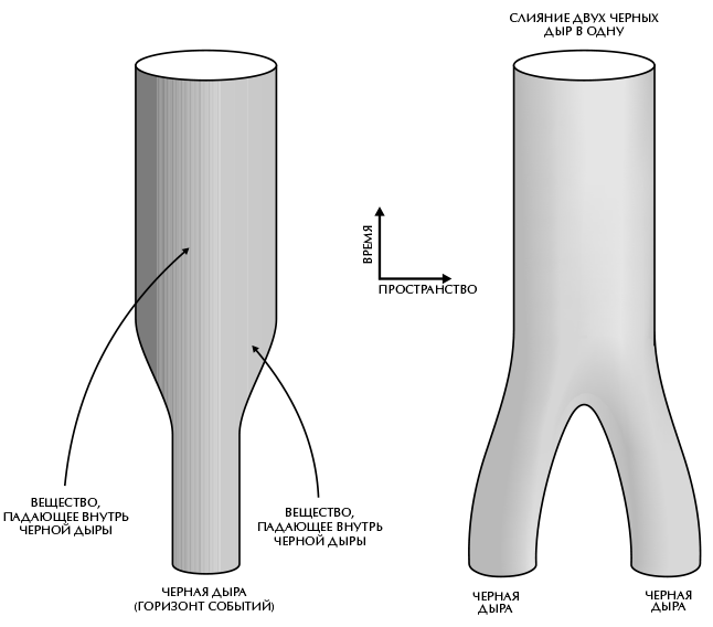 Если пути лучей света, образующие горизонт событий – границу черной дыры, – никогда не сближаются, то площадь горизонта событий может оставаться неизменной или увеличиваться со временем, но ни в коем случае не уменьшаться. Ведь это означало бы, что как минимум часть лучей света на границе должны сближаться. В действительности площадь эта увеличивается каждый раз, когда вещество или излучение падают в черную дыру (рис. 7.2). А при столкновении или слиянии двух черных дыр и последующем образовании новой черной дыры площадь горизонта событий последней будет больше или равна сумме площадей горизонтов событий исходных черных дыр (рис. 7.3). Это свойство «неуменьшения» площади горизонта события накладывает важное ограничение на возможное поведение черных дыр. Я так разволновался из-за этого открытия, что той ночью почти не спал. На следующий день я позвонил Роджеру Пенроузу, и он согласился со мной. Вообще-то я думаю, что он уже знал об этом свойстве площади [горизонта событий]. Правда, он использовал немного иное определение черной дыры. Он не осознавал, что оба определения задают одни и те же границы черной дыры и, следовательно, одно и то же значение площади при условии, что черная дыра достигла состояния, которое не меняется со временем.