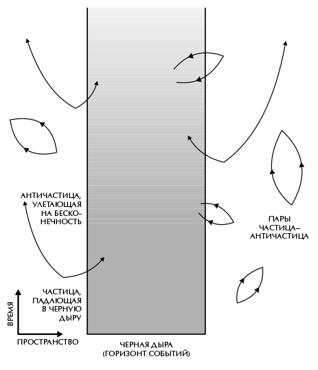 Как же черная дыра умудряется испускать частицы, когда известно, что ничто не может уйти из-под ее горизонта событий? Квантовая механика отвечает на этот вопрос так: частицы появляются не из «нутра» черной дыры, а из «пустого» пространства сразу за горизонтом событий. Это следует понимать следующим образом: пространство, которое мы считаем «пустым», не может быть таковым в действительности, потому что это означало бы, что все поля, включая электромагнитное и гравитационное, должны быть равны нулю. Но величина поля и скорость его изменения со временем сходны с положением и скоростью частицы: согласно принципу неопределенности, чем точнее одна из этих величин, тем с меньшей точностью мы можем рассчитать другую. Так, в «пустом» пространстве поле не может быть в точности равно нулю, поскольку в этом случае оно имело бы точное значение (нулевое) и точную скорость изменения (тоже нулевую). Величина поля должна содержать некоторую минимальную неопределенность, или квантовые флуктуации. Эти флуктуации можно рассматривать как пары частиц света или гравитации, которые совместно рождаются в некоторое время, расходятся, а затем снова сходятся и взаимно аннигилируют. Это виртуальные частицы, аналогичные тем, что переносят гравитационную силу Солнца: в отличие от реальных частиц, их невозможно обнаружить непосредственно – с помощью детектора частиц. Но их косвенные проявления – например, небольшие изменения энергии орбит электронов в атомах – поддаются измерению и замечательно согласуются с теоретическими предсказаниями. Из принципа неопределенности также следует возникновение сходных виртуальных пар частиц вещества, таких как электроны и кварки. Но в этом случае один из членов пары должен быть частицей, а второй – античастицей (античастицы света и гравитации совпадают с соответствующими частицами).