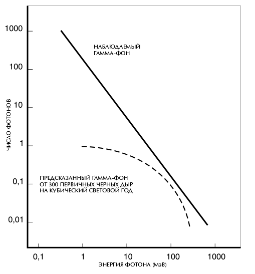 Даже если нам не удастся приручить излучение первичных черных дыр, то каковы наши шансы обнаружить и наблюдать их? Можно пытаться обнаружить гамма-излучение, которое первичные черные дыры испускают на протяжении большей части своей жизни. Хотя излучение большинства таких объектов по отдельности должно быть очень слабым из-за внушительного расстояния, которое отделяет их от нас, суммарное излучение вполне можно зарегистрировать. И такой гамма-фон действительно наблюдается: на рисунке 7.5 показано, как меняется наблюдаемая интенсивность гамма-излучения в зависимости от частоты (то есть количества волн в секунду). Однако такой фон мог быть – и вероятно, является – следствием иных процессов, не связанных с первичными черными дырами. Пунктирная линия на рисунке 7.5 демонстрирует, как должна меняться интенсивность при различных частотах гамма-излучения, испускаемого первичными черными дырами, если плотность этих объектов составляет в среднем 300 черных дыр на один кубический световой год. Поэтому можно сказать, что наблюдения гамма-фона не свидетельствуют напрямую о существовании первичных черных дыр, но говорят нам, что в среднем на каждый кубический световой год во Вселенной не может приходиться более 300 таких объектов Этот предел означает, что на первичные черные дыры может приходиться не более одной миллионной доли всего вещества во Вселенной.