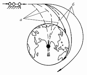 Рис. 25. Падение движущихся по касательной к поверхности Земли тел: а – по Галилею; б – по Ньютону