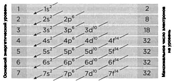 Представим себе атом с большим числом электронов. Как они распределяются вокруг ядра? Если отказаться от понятия орбиты, траектории электронов нарисовать уже нельзя, но, следуя постулатам новой квантовой механики, можно назначить им квантовые числа. Числа, косвенно отражающие уровни энергии. Любая физическая система стремится к состоянию наименьшей энергии. Если бы это было так, все электроны в стабильном атоме стремились бы к одному и тому же уровню, самому низкому. Принцип Паули запрещает именно это: не может быть двух электронов с одинаковыми квантовыми числами. Так электроны постепенно заполнят различные уровни (орбитали), начиная с самой низкой энергии. По этому правилу, орбитальная структура следует порядку стрелок на прилагаемом рисунке. Целые числа 1, 2, 3... представляют первое квантовое число, которое Бор ввел в 1913 году. Буквы s, р, d, f... представляют, в свою очередь, два квантовых числа, которые ввел Зоммерфельд: s изначально соответствовало круговой орбите; р — трем орбитам с одним и тем же эксцентриситетом, но с различными прецессиями; d — пяти орбитам, f— семи. Наконец, благодаря спиновому квантовому числу на каждой из этих орбиталей может быть по два электрона, один с положительным спином, а другой с отрицательным. Например, в случае с атомом меди, содержащим 29 электронов, его электронная конфигурация будет следующей: