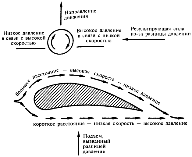 Когда бейсбольный мяч или мяч для гольфа летит, вращаясь, сквозь воздух, то одна сторона его вращается вместе с движением воздуха, текущего мимо мяча во время движения; другая же сторона мяча вращается против этого движения. Сторона, которая крутится против движения, имеет большую скорость относительно воздуха, и сопротивление воздуха в этом направлении, меньше. Шар бросают в направлении более низкого давления, так чтобы бейсбольный мяч «изогнулся» во время своего полета (чего обычно и добивается питчер[46], бросающий мяч), в то время как мяч для гольфа «идет крюком» или «мажет» (что обычно нежелательно).