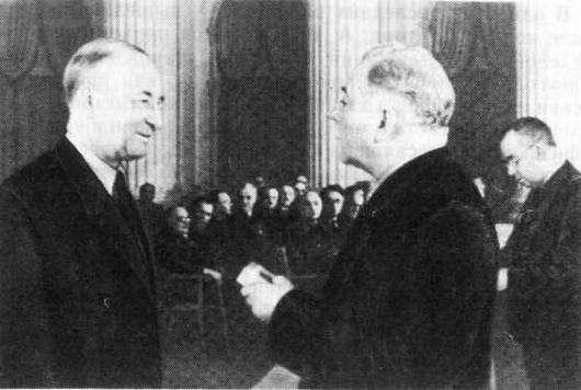 К. Е. Ворошилов вручает А. В. Шубникову орден Ленина.