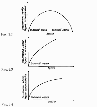 Сам Фридман рассматривал только одну модель, но можно указать три разные модели, для которых выполняются оба фундаментальных предположения Фридмана. В модели первого типа (открытой самим Фридманом) Вселенная расширяется достаточно медленно для того, чтобы в силу гравитационного притяжения между различными галактиками расширение Вселенной замедлялось и в конце концов прекращалось. После этого галактики начинают приближаться друг к другу, и Вселенная начинает сжиматься. На рис. 3.2 показано, как меняется со временем расстояние между двумя соседними галактиками. Оно возрастает от нуля до некоего максимума, а потом опять падает до нуля. В модели второго типа расширение Вселенной происходит так быстро, что гравитационное притяжение хоть и замедляет расширение, не может его остановить. На рис. 3.3 показано, как изменяется в этой модели расстояние между галактиками. Кривая выходит из нуля, а в конце концов галактики удаляются друг от друга с постоянной скоростью. Есть, наконец, и модель третьего типа, в которой скорость расширения Вселенной только-только достаточна для того, чтобы избежать сжатия до нуля (коллапса). В этом случае расстояние между галактиками тоже сначала равно нулю (рис. 3.4), а потом все время возрастает. Правда, галактики «разбегаются» все с меньшей и меньшей скоростью, но она никогда не падает до нуля.