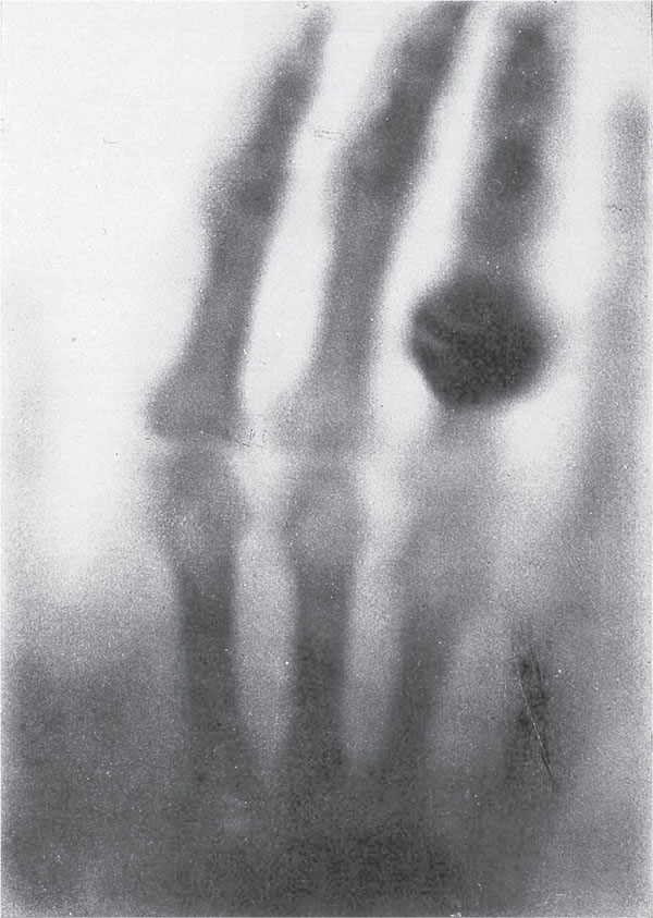 На одном из первых рентгеновских снимков мы видим кости и замечательное кольцо Берты Рентген, жены Вильгельма Рентгена. Вильгельм, опасавшийся, что сошел с ума, успокоился, когда супруга тоже увидела свои кости на покрытой барием пластинке. Она, будучи не такой отважной, приняла этот снимок за предзнаменование смерти