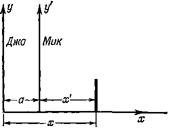 Когда Джо определяет положение произвольной точки в пространстве, он находит три ее координаты: x, y и z (обычно мы опускаем ось z, ибо ее трудно изобразить на нашем чертеже). В системе Мика эта точка будет иметь другое значение х (чтобы отличить его, введем обозначение х') и, вообще говоря, другое значение у, хотя в нашем примере они численно равны. Таким образом, мы имеем