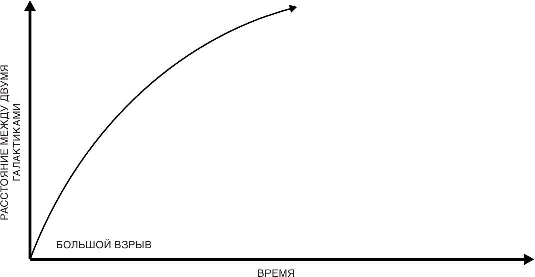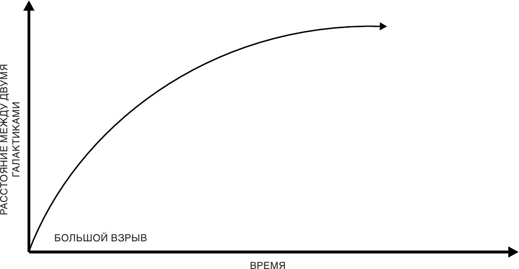 Сам Фридман рассматривал только одну модель, но можно указать три разные модели, для которых выполняются оба фундаментальных предположения Фридмана. В модели первого типа (открытой самим Фридманом) Вселенная расширяется достаточно медленно для того, чтобы в силу гравитационного притяжения между различными галактиками расширение Вселенной замедлялось и в конце концов прекращалось. После этого галактики начинают приближаться друг к другу, и Вселенная начинает сжиматься. На рис. 3.2 показано, как со временем меняется расстояние между двумя соседними галактиками. Оно возрастает от нуля до некоего максимума, а потом опять падает до нуля. В модели второго типа расширение Вселенной происходит так быстро, что гравитационное притяжение хоть и замедляет расширение, но не может его остановить. На рис. 3.3 показано, как изменяется в этой модели расстояние между галактиками. Кривая выходит из нуля, а в конце концов галактики удаляются друг от друга с постоянной скоростью. Есть, наконец, и модель третьего типа, в которой скорость расширения Вселенной только-только достаточна для того, чтобы избежать сжатия до нуля (коллапса). В этом случае расстояние между галактиками тоже сначала равно нулю (рис. 3.4), а потом все время возрастает. Правда, галактики «разбегаются» все с меньшей и меньшей скоростью, но она никогда не падает до нуля.