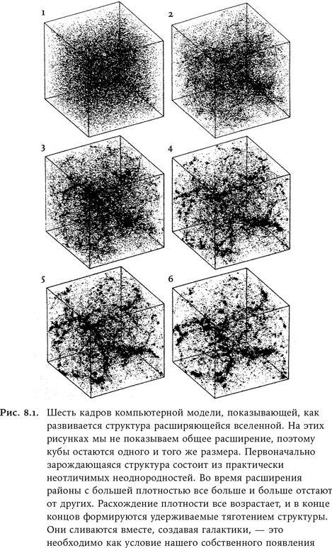 Компьютерные модели, которые показывают этот процесс хотя бы в грубом приближении, можно прокручивать, как фильмы, ускоряя расширение Вселенной и развитие галактик примерно в 1016 раз по сравнению с реальными событиями! На рисунке 8.1 показаны шесть кадров из такой симуляции.