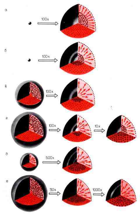 Рис. 6.1. Внутреннее строение звезды с массой в 7 раз больше солнечной на разных стадиях ее развития. Звезды в левой части рисунка изображены в одинаковом масштабе. Правее показано строение внутренней части звезд. Эти рисунки увеличены. На рис. г и е внутренние области увеличены дважды. Обозначения такие же, как и на рис. 4.2 и 5.2. При ядерном горении гелия возникает углерод. Слой, обогащенный углеродом, показан малыми черными кружками, а — молодая звезда, находящаяся на главной последовательности. Внутренняя часть звезды занята конвективным слоем; б — та же звезда через 26 миллионов лет. Диаметр звезды практически не изменился, однако во внутренней области уже начался переход к горению в сферическом слое. Это показано на левой верхней плоскости схематического разреза; в — 26,5 миллионов лет спустя после начала горения водорода в центре звезды образуется область, обогащенная гелием. Горение водорода идет только в тонком сферическом слое. Радиус звезды резко возрос. В звезде возник толстый внешний конвективный слой, который хорошо виден на правой верхней плоскости разреза в левой части рисунка; г — внутреннее строение звезды через 100000 лет после начала ядерной реакции превращения гелия в углерод. Теперь в звезде идет горение гелия в центре и горение водорода во внешнем сферическом слое. Радиус звезды стал еще больше; д — через 34 миллиона лет после начала горения водорода в центре звезды исчерпывается запас гелия. Теперь ядерное горение происходит в двух сферических слоях: во внешнем водород превращается в гелий, а во внутреннем гелий превращается в углерод. Звезда стала существенно меньше и потеряла свою внешнюю конвективную зону; е — еще через 2 миллиона лет звезда вновь становится красным сверхгигантом. В ней больше нет слоя, где происходит горение водорода. Теперь звезда существует только за счет ядерной реакции превращения гелия в углерод. Ее химический состав сильно усложнился. Во внешнем слое по-прежнему существует исходное, богатое водородом вещество, ниже лежит толстый слой гелия, который окружает центральную область, состоящую из углерода.