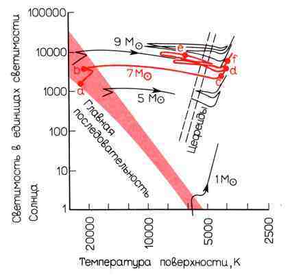 Рис. 6.2. Пути развития звезд с различными массами (возле траекторий указаны величины их масс в единицах массы Солнца). Если путь развития звезды с массой, равной солнечной, ведет ее в область красных гигантов (см. также рис. 5.1), то более тяжелые звезды приходят в область красных сверхгигантов. Траектория развития звезды с массой в 7 раз больше солнечной показана красным цветом. На этой траектории буквами отмечены точки, для которых на рис. 6.1 показана внутренняя структура этой звезды. Параллельные штриховые линии ограничивают на диаграмме область существования цефеид.