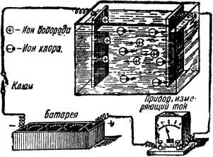 Рис. 31. Движение заряженных частичек — ионов — в электролите.