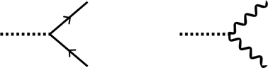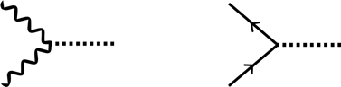Я имею в виду, что, если мы сможем сфокусировать достаточно энергии в одной точке пространства, мы можем тем самым спровоцировать появление реальных частиц Хиггса, и их можно будет измерить. Это можно представить примерно так. Говоря языком физики элементарных частиц, используя фейнмановские диаграммы, мы можем считать, что виртуальная частица Хиггса появляется из фонового хиггсовского поля, придавая массу другим частицам. Левая диаграмма соответствует рассеянию частиц, таких как кварки и электроны, на виртуальной частице Хиггса; частицы отклоняются от своего маршрута, испытывая, таким образом, сопротивление своему движению вперед. На правой диаграмме представлен тот же эффект для таких частиц, как W и Z.