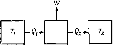 Предположим, что «котел» построенной нами тепловой машины поддерживается при температуре Т1. За счет отнятого у котла тепла Q1 пар совершил работу W и выделил в «конденсоре» тепло Q2 [температура конденсора равна Т2 (фиг. 44.3)].