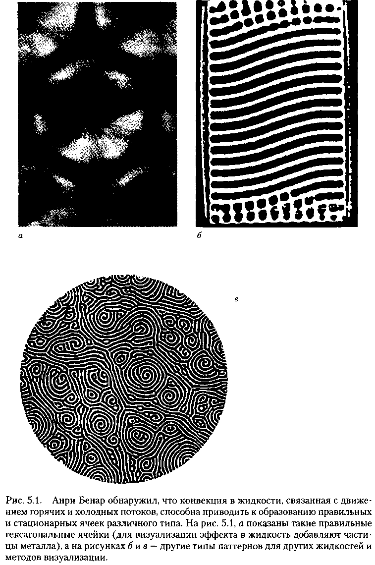 При других экспериментальных условиях конвективные узоры (паттерны) становятся еще более сложными (рис. 5.1, б и в). Кстати, д’Арси Томпсон также отметил конвективные узоры в клубах табачного дыма и сравнил их с формой причудливых облаков, которые в Англии называются макрелевыми4, вероятно, за внешнее сходство с косяками этой промысловой рыбы. Механизм их образования действительно оказался связан с конвективными потоками в атмосфере, однако Томпсону, конечно, не удалось объяснить, почему в атмосфере образуются такие узоры. В 1916 году знаменитому физику лорду Рэлею удалось наконец описать на основе гидродинамики образование регулярных конвективных потоков типа показанных на рис. 5.1, б, Окончательное теоретическое решение задачи было получено лишь в 1960-х годах, однако и сейчас никто не может предсказать, какие именно паттерны проявятся в заданной неравновесной системе при определенных условиях Именно эта неопределенность и означает упомянутое отсутствие общегс правила, эквивалентного правилу Гиббса для равновесных систем.