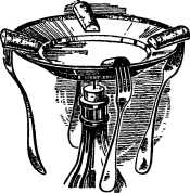 Как уравновесить тарелку на острие иглы? Ты, конечно, сразу сообразишь, что для этого нужно подобрать что-нибудь потяжелее тарелки. В нашем опыте взяты четыре вилки. Только они должны быть стальные; алюминиевые слишком легки.