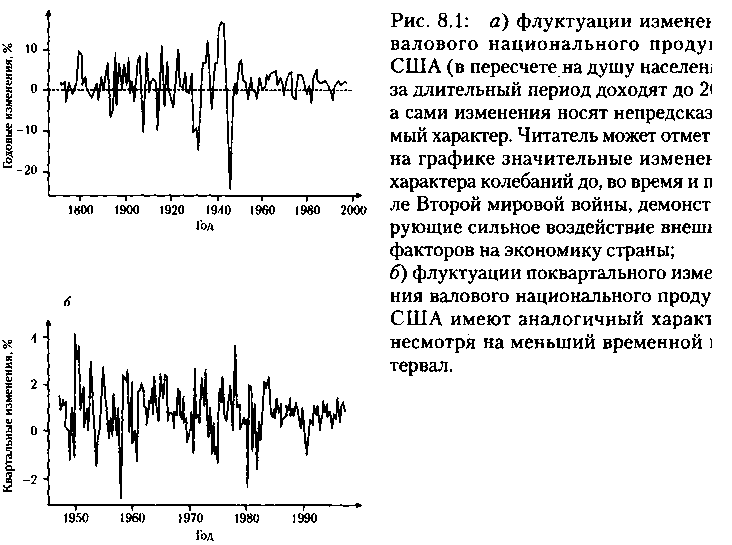 В действительности дело обстоит еще хуже, что можно доказать бс внимательным изучением тех же статистических данных. Приведен] в верхней части рис. 8 данные относились к годовым показателям валового национального продукта США, а в нижней части (рис. 8.1, б) дан аналогичный график, составленный по ежеквартальным показателям. Легко заметить поразительное сходство графиков, после чего говорить о каких-то экономических циклах просто не имеет смысла. Хочется спросить авторов многих моделей, где они находят рассматриваемые ими циклы?